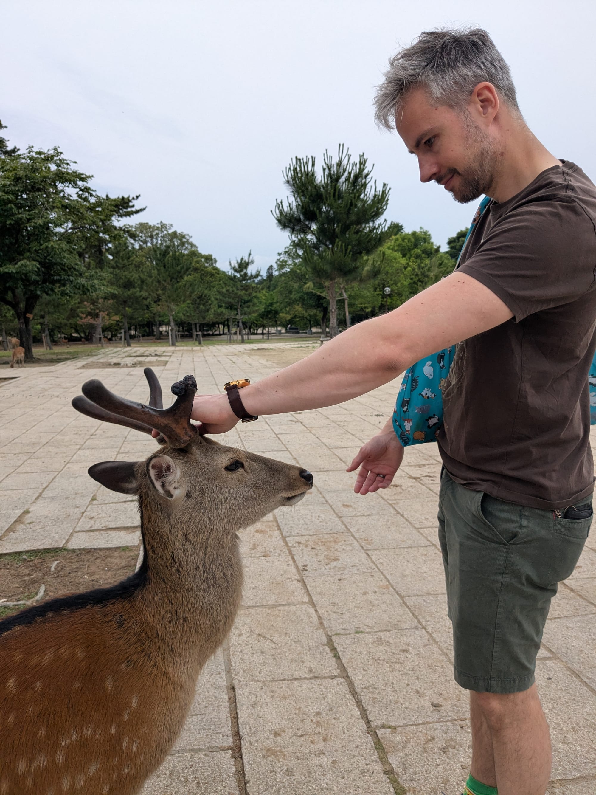 Naast het boeken van de trein hebben we gister nog iets anders gedaan: het boeken van een hotel (oeps, vergeten) en het aaien van herten in Nara. Het Japan dat we een aantal dagen geleden zagen in Namba en Dotonbori is indrukwekkend en leuk voor een keer, maar toch niet helemaal ons ding. Laat ons maar dieren aaien.
