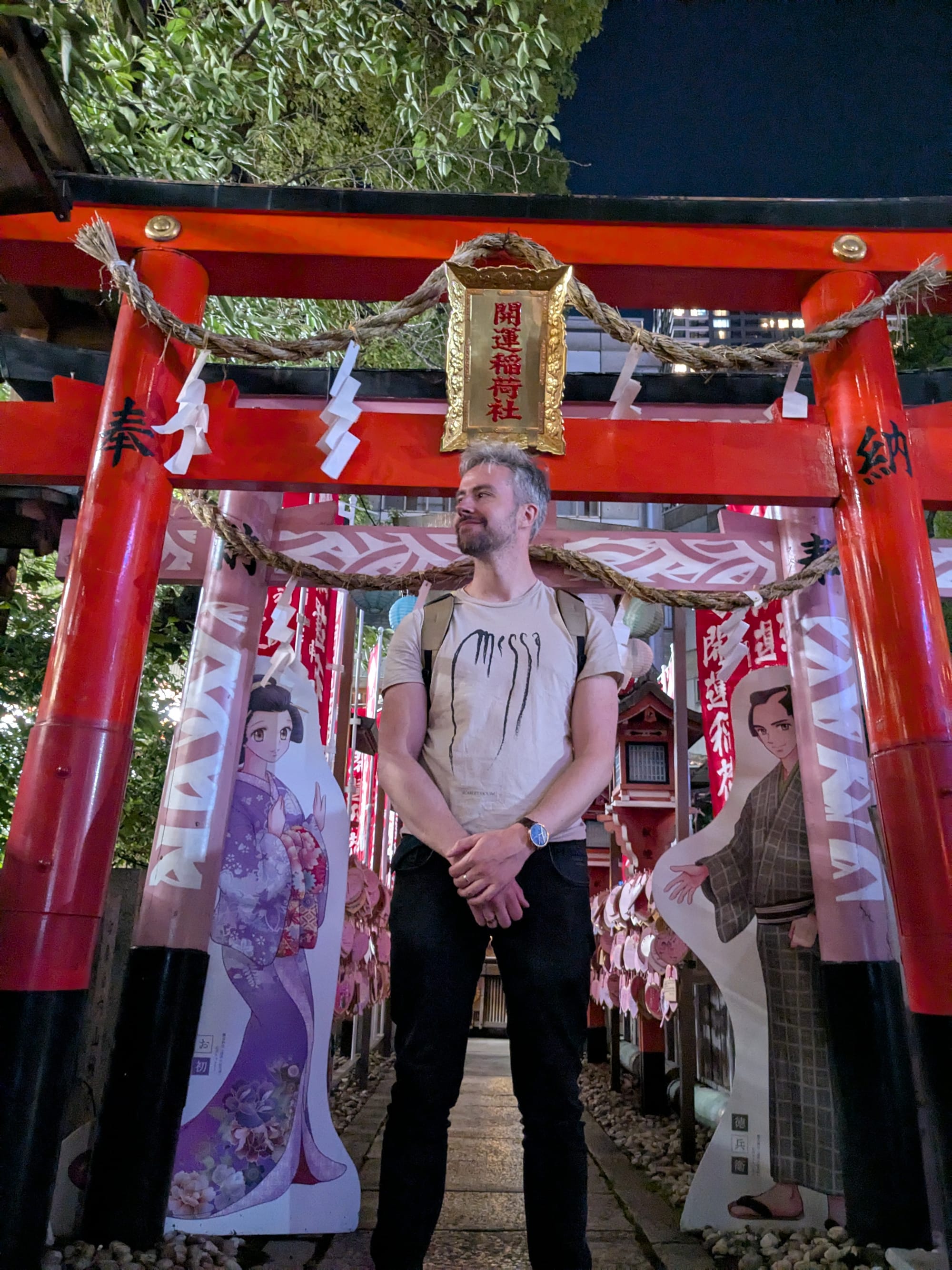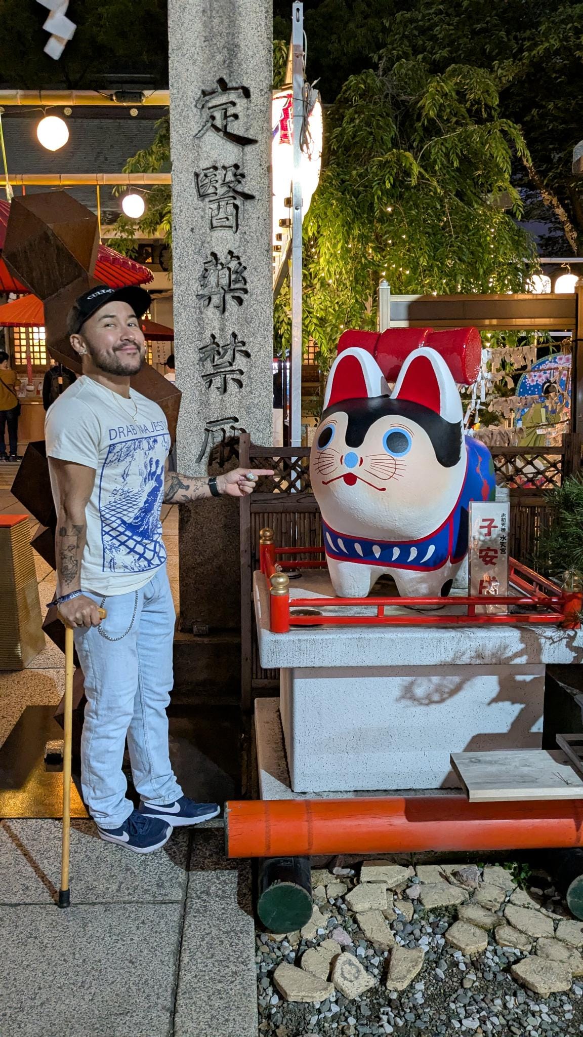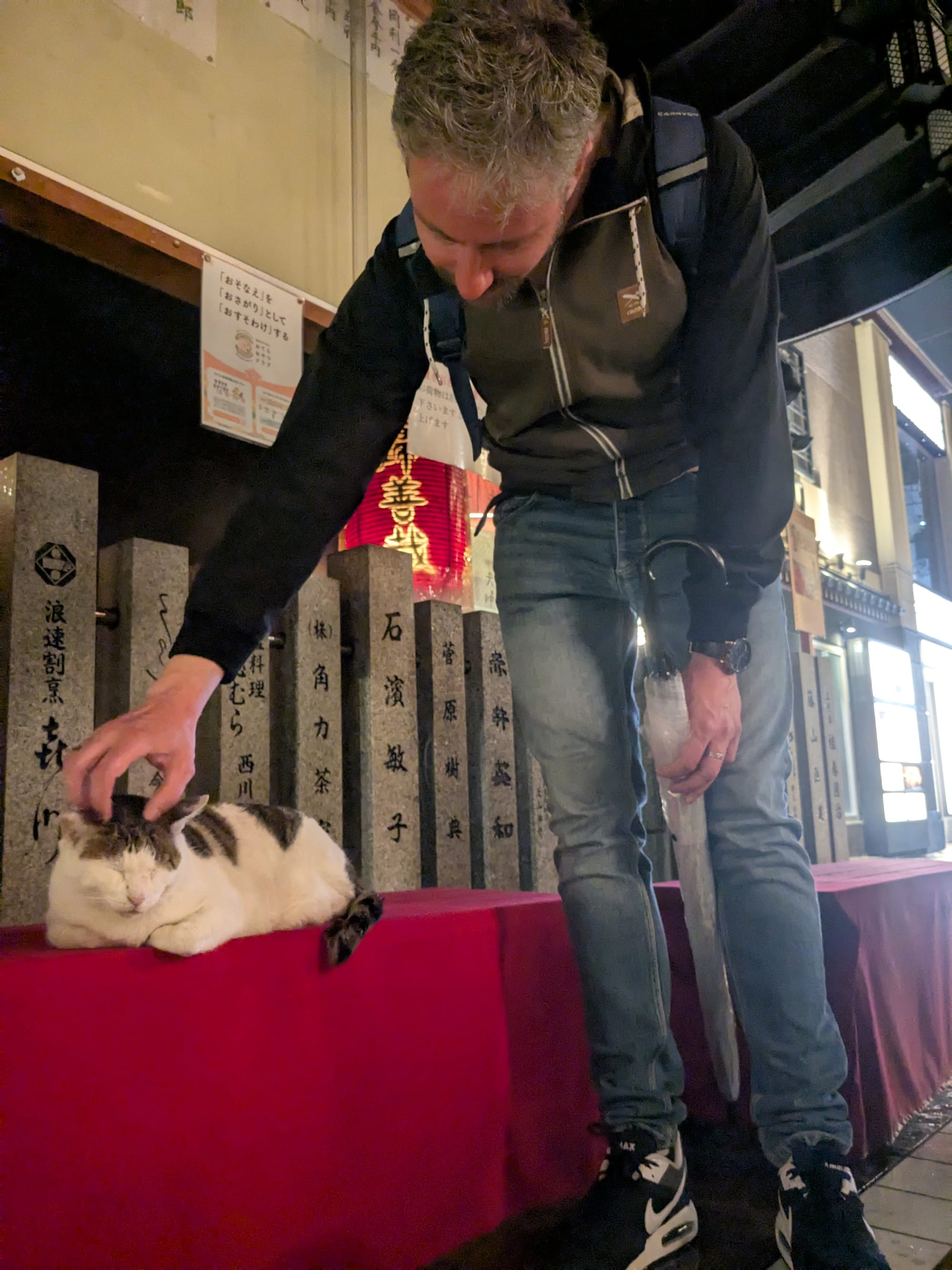Van al dat eten word je blijkbaar moe dus we sleepten onszelf richting het hotel. Vanuit onze ooghoeken zagen we een tempelpoort dus we gingen toch even kijken. Blijkt er een tempel met kattenbeeldjes én echte kat in de buurt van ons hotel te zitten! De sfeer hier was ook ontzettend fijn. Het was er rustig en prachtig verlicht zo in de avond. Enorm prettig om hier even rond te hangen en de kat te aaien om zo onze batterij verder op te laden voor de barre tocht van 10 minuten richting het hotel. Deze moeten we zeker nog eens bezoeken voor onze goshuincho.