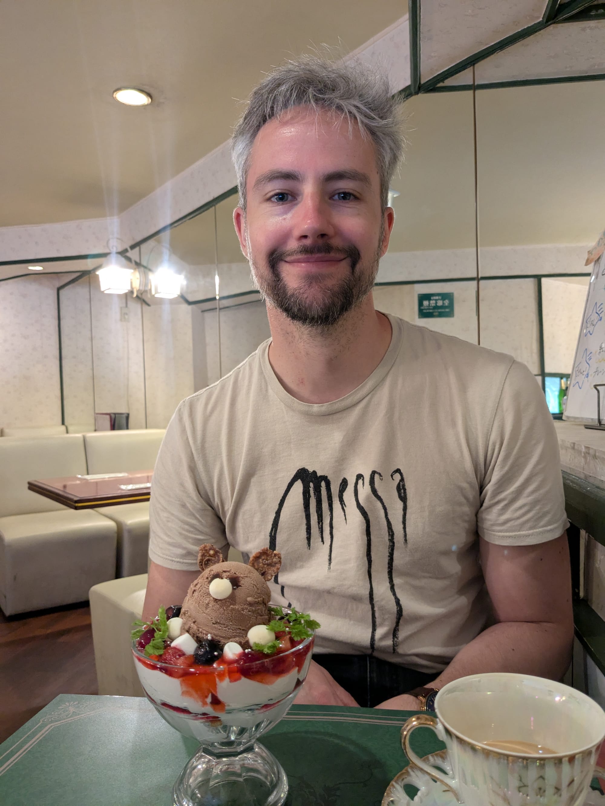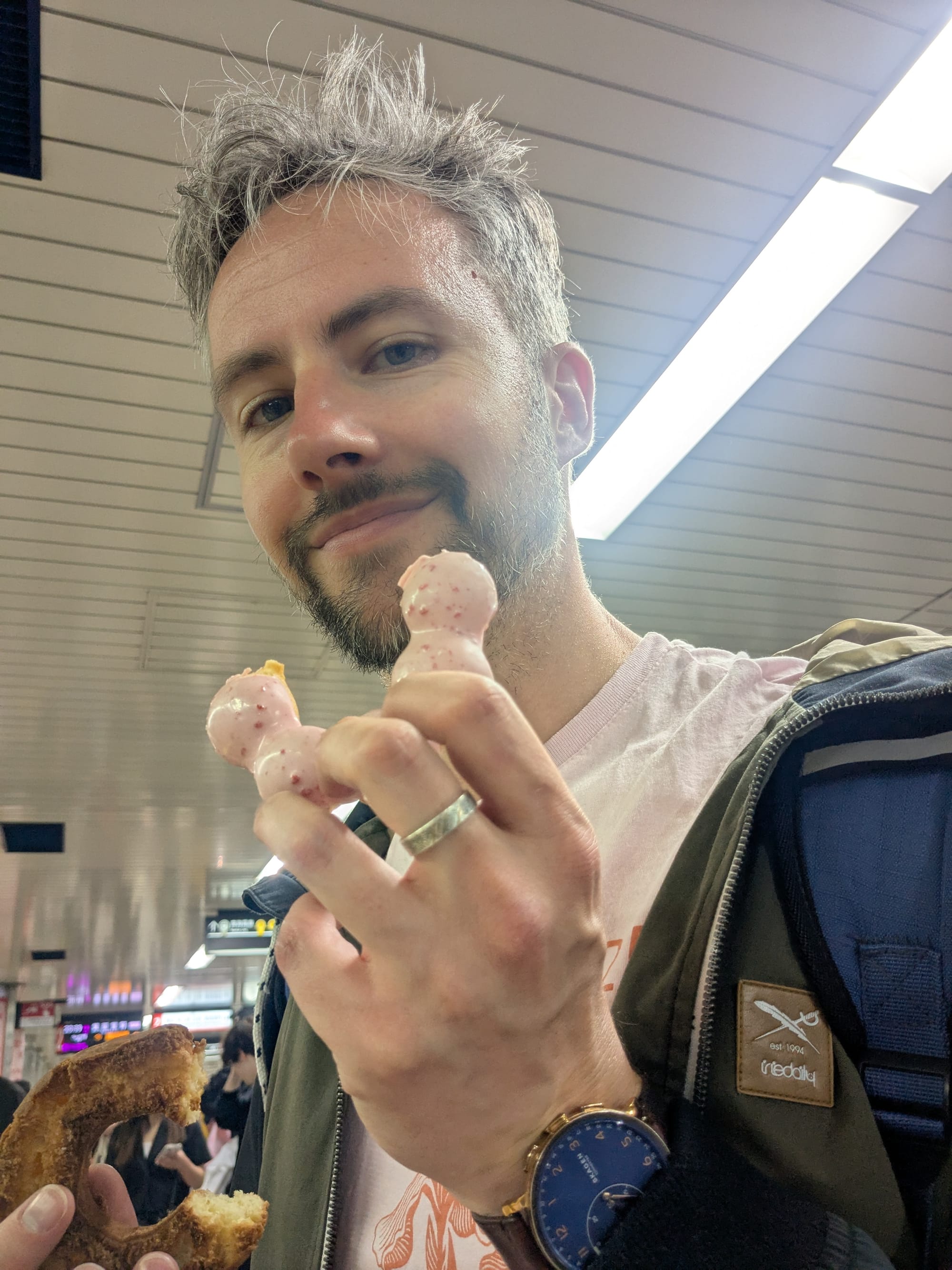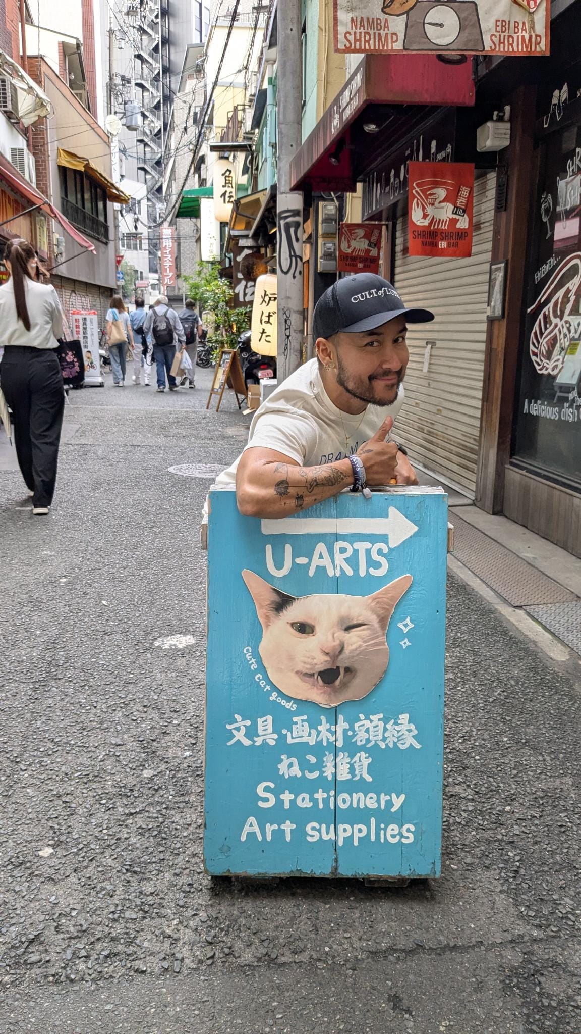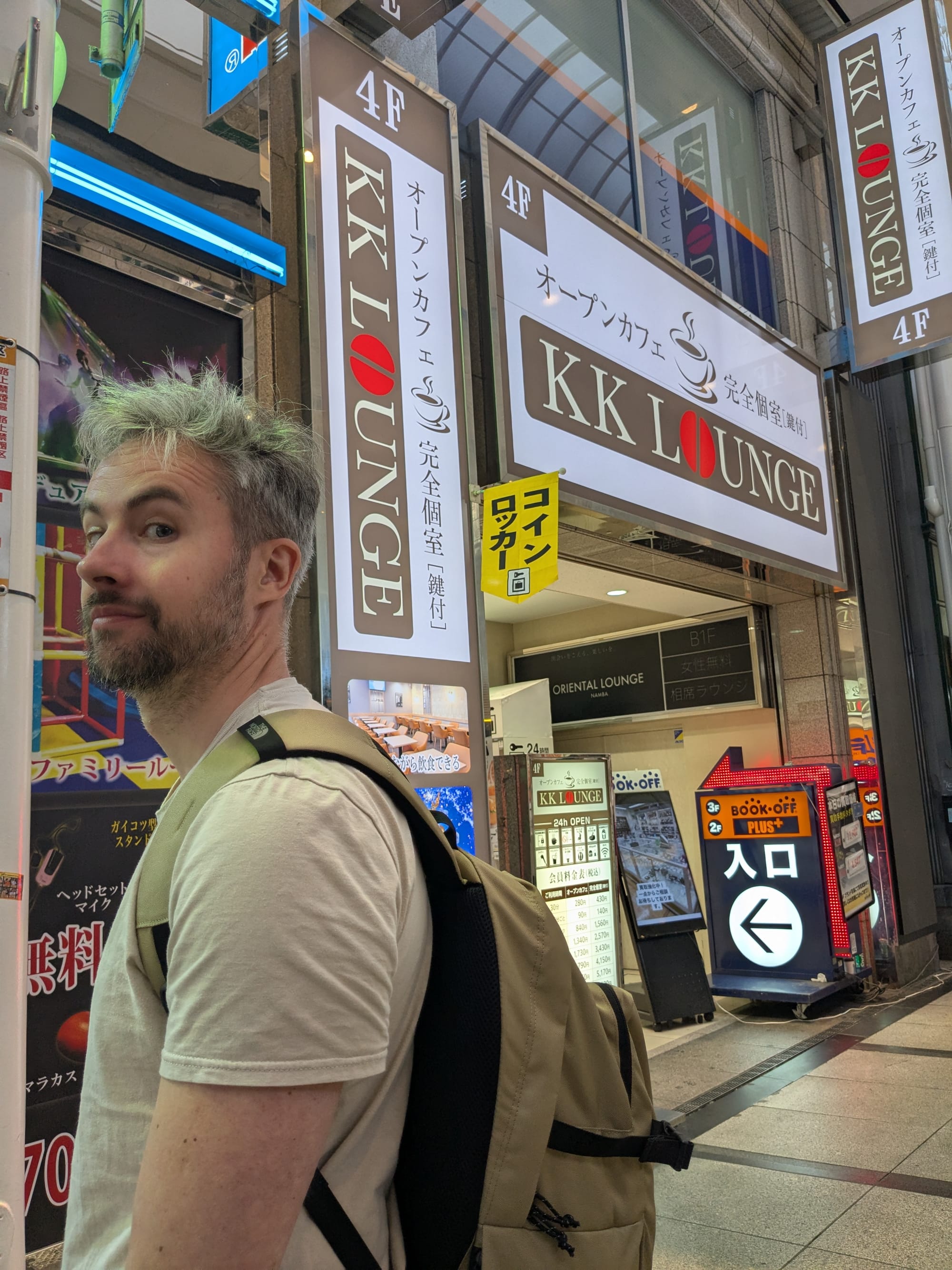 Om vervolgens gelijk weer te vertrekken richting Namba. Geert scheurt niet alleen regelmatig uit zijn onderbroek, maar nu was ook zijn tas gescheurd en hadden we direct een nieuwe nodig. Anders ligt al mijn tentakelhentai binnen de kortste keren op de grond. Nu zijn wij zoals eerder gezegd geen shoppers, dus dat klusje zou zo geklaard zijn. Blijkt dat Namba nóg intenser is dan Tokyo. Misschien omdat het zaterdagavond was maar holy shit dit was file lopen tussen wat Geert mooi "troepwinkels" noemt. Een miljard prikkels later hadden we wel een geslaagde buit van onder andere een nieuwe tas en eindelijk een pillendoosje voor mij. Ik heb namelijk niet genoeg hersencapaciteit om te onthouden wat ik wanneer moet innemen. Niet dat zo'n doosje daarbij helpt want die heeft de hele dag in de tas gezeten, maar schattig is hij wel. Ik lig nu alleen te comfortabel in bed en ben te lui om een foto te maken. Neem in plaats daarvan Geert met heus geen anal beads als toetje en Geert met kat. Toch nog een goede afsluiter van de dag dus.
