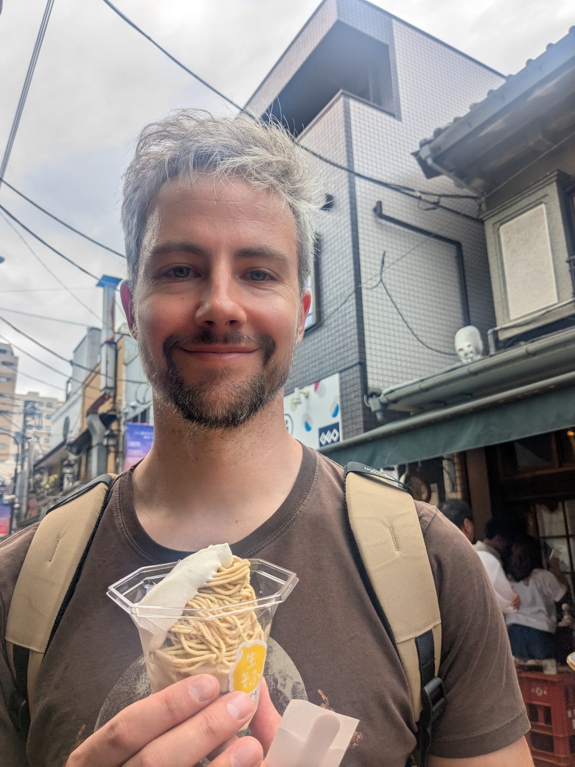 Afleiding was er genoeg: er waren overal kattenbeelden, een gachapon-winkel, een winkel waar ze ijs verkochten dat eruit zag als spaghetti (dat heet hier blijkbaar een Mont Blanc?) en smaakte naar kastanje, en een klein steegje met een heleboel duiven. Ik als kastanjefanboy en duivenheerser kon mijn geluk niet op.