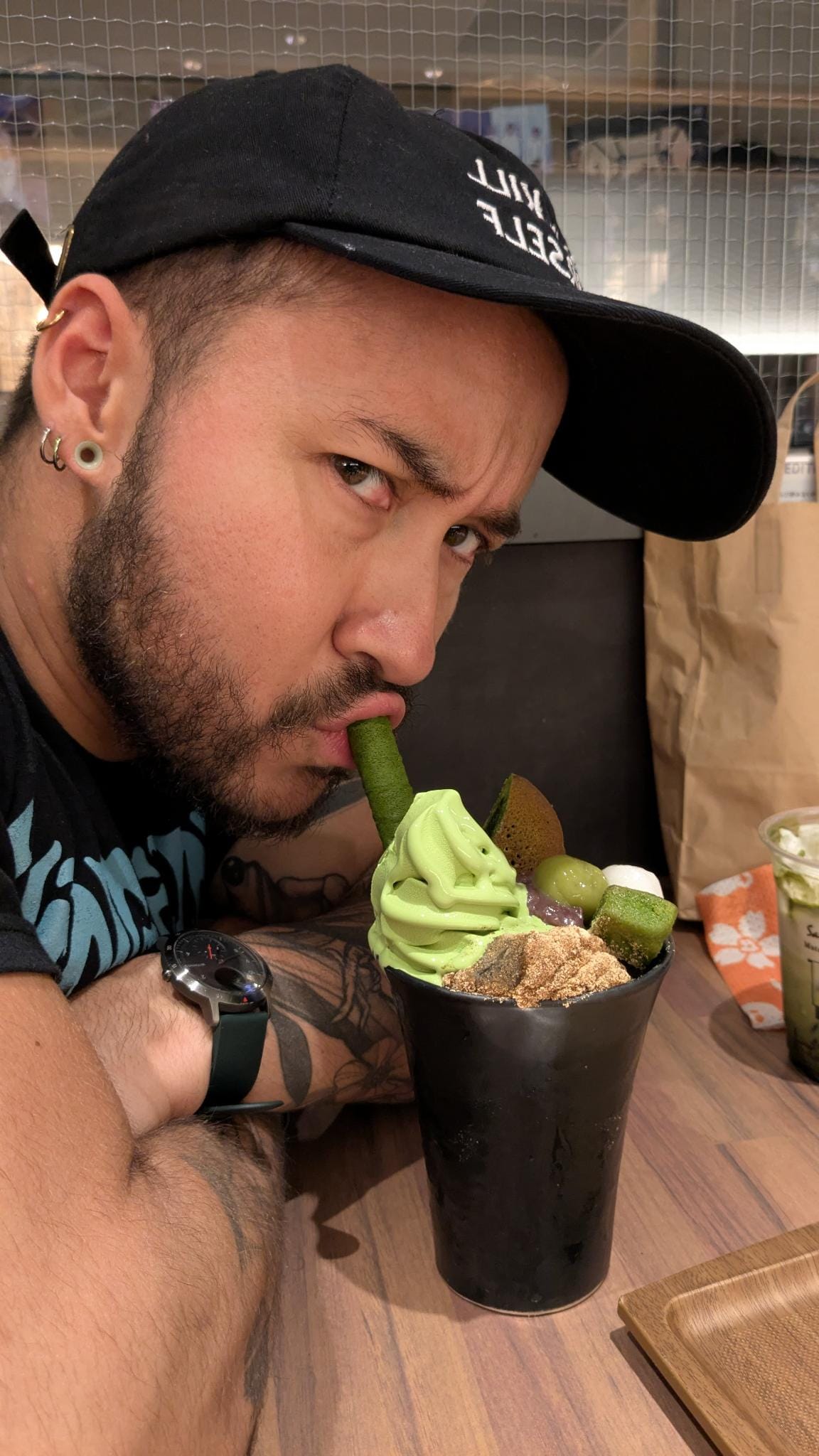We vonden hem al relatief prijzig, maar al gauw begrepen we waarom: het was ongeveer anderhalve maaltijd per parfait. En dat zeg ik als papzak. Van matcha-ijs tot warabi mochi, gewone mochi, rode bonenpasta, matcha cake... Het enige wat nog miste was matcha om te snuiven van de matcha-spiegel. One can dream.